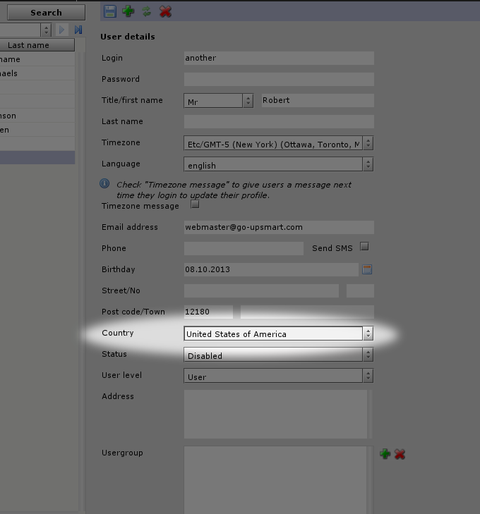 States_id, from the SOAP API, defines the country and stores it in the table address. (I suppose that makes sense.) You can find it under the column state_id. This is how the user’s “Country” is defined in the user management gui (see below)